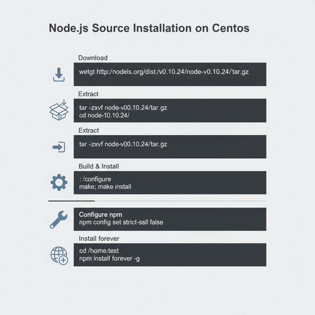 $> wget http://nodejs.org/dist/v0.10.24/node-v0.10.24.tar.gz $> tar -zxvf node-v0.10.24.tar.gz $> cd node-v0.10.24/ $> ./configure $> make;make install - node.js를 이용해 forever 모듈설치하기